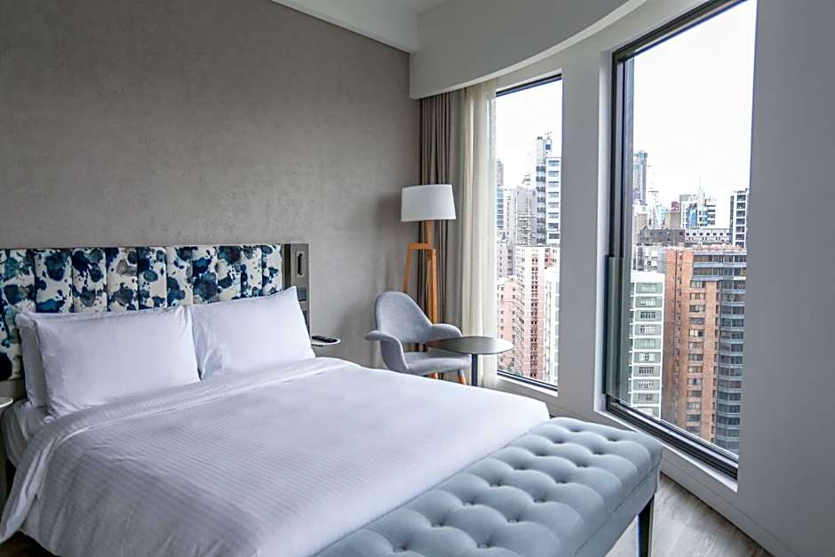 Designed to accommodate up to 4 people, this room is equipped with 2 double beds. The room comes with big floor-to-ceiling windows looking out greenery view of the Kowloon Cricket Club and with plenty of natural light. It is equipped with an air purifier. Fresh air along with a calming landscape allow guests to be submerged in the surroundings, to rest and to refuel. Ths nonsmoking room is provided with complimentary use of a 4G pocket WiFi device, 43-inch flat-screen TV, open wardrobe for usage flexibility, high-thread-count bedding and branded bathroom amenities.